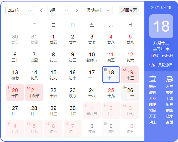 9月19日(星期日)放假,9月22日(星期三)上班;9月19日(星期日)至9月21日(星期二)放假調(diào)休,共3天。